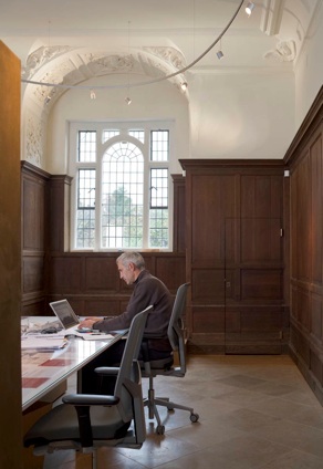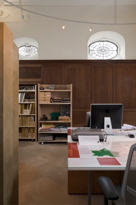 The public use the front doors and see little evidence of an office. Flexible storage and desking are removable. During working hours the units open up to reveal the clutter of work. All support services are located in a new build, temporary annexe.
